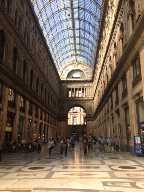On our way to find the tram to Vomero (up on the hill), we stumbled upon the Galleria that I had been looking for. Filled with tourists, it was beautiful inside. From there, we found the nearest Funicolare (trolley-like train up the hill) an headed to Vomero. Being on a castle-kick, we decided to check out the the second castle of the day, Castel Sant’Elmo. Following signs, we hiked and and after an interesting cobblestone uphill walk, found the castle. From there, finding the entrance was another challenge. We immediately found a “lift” in a little cave and figured it couldn’t possibly be the entrance, so we aimlessly continued to walk around the castle. We ended up walking FAR and UP many cobblestone ramps. It was quite comical as we had no idea if we were heading in the right