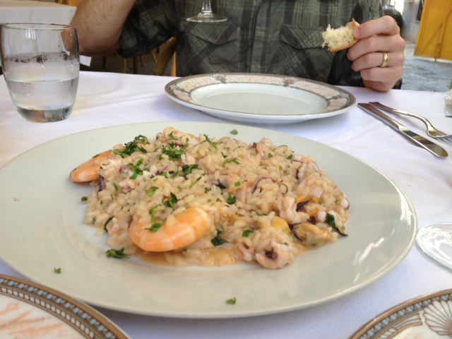 For antipasti, we ordered some bruschetta and some marinated fish. We weren’t sure what kind of fish as it was in Italian on the menu, but were feeling adventurous. It turned out to be marinated mackarel and quite tasty. For primo piatto, we had some delicious seafood risotto, which was my favorite part of the meal. It had octopus and shrimp in it. Our secondo piatto was a variety of fish that included shrimp, calamari and another white fish. The calamari and shrimp were fantastic, but the white fish was not so much. After our great meal, we grabbed some gelato and went to pick up the kids from school.
